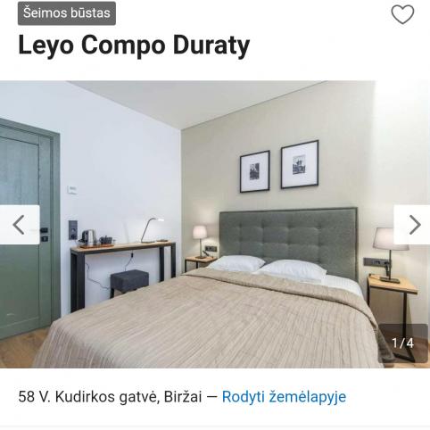 Interneto paieškos laukelyje pateikus užklausą apie apgyvendinimo įstaigas Biržuose, visame pasaulyje keliautojų žinoma booking.com platforma pateikia jų sąrašą. Dėmesį patraukia neįtikėtinai prabangūs apartamentai, neva, esantys Biržuose. Internete nurodyta, kad Biržų mieste, Kudirkos g. 58, įsikūrusi ištaiginga apgyvendinimo įstaiga, įvardinta kaip „šeimos būstas“, pavadinimu „Leyo Compo Duraty“. Pateikiamos ir kambarių nuotraukos, kuriose pavaizduoti prabangūs miegamieji, vonios kambariai. Tiesa, kaip tas „būstas“ atrodo iš lauko, nuotraukų nėra. Informacijoje apie „šeimos būstą“ teigiama, kad apartamentuose yra sūkurinė vonia, balkonas, plačiaekranis televizorius, oro kondicionierius, baras, balkonas, sodas, privati automobilių stovėjimo aikštelė ir kiti viešbučiams būdingi privalumai. Į tą pačią kainą įskaičiuoti net amerikietiški bei angliški pusryčiai. Tačiau labiausiai stebina kambarių kainos – už naktį, praleistą šiuose apartamentuose, vienas žmogus turėtų sumokėti 292 eurus, o apsistojus dviese – 361 eurą. Tokias sumas turistai įprastai pakloja už prabangius liukso klasės viešbučių kambarius didmiestyje ar apartamentus, pro kurių langus atsiveria vaizdas į jūrą.