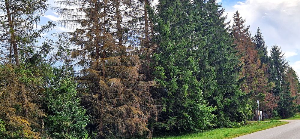 Užtvankos gatvėje, vedančioje link Astravo, masiškai džiūstančios eglės stebina biržiečius – kodėl savivaldybė kerta sveikus, o pažeistų nemato?