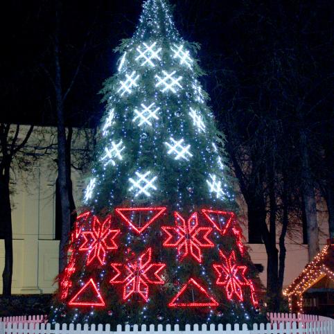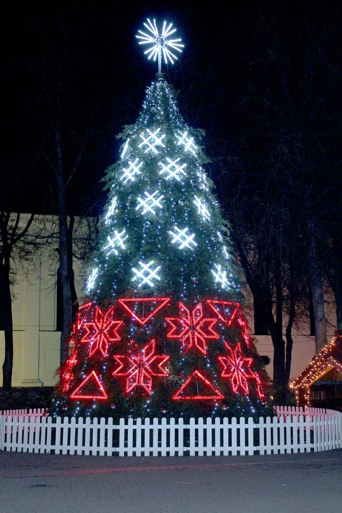 Praė­ju­sio penk­ta­die­nio va­ka­rą Bir­žuo­se bu­vo įžieb­ta et­nog­ra­fi­niais raš­tais pa­puoš­ta eg­lė.