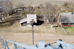 SUGRĮŽIMAS: Gandras, matydamas kad fotografas nesirengia nulipti nuo grūdų saugyklos daugiau nei pusvalandį, trumpam buvo sugrįžęs apžiūrėti savojo lizdo.