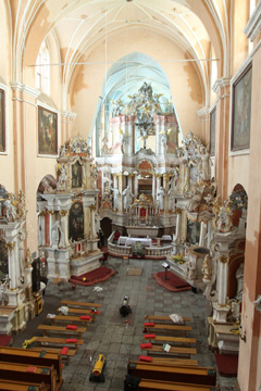 Bažnyčios viduje talkino apie 10 moterų. Šveitė centrinio altoriaus prieigas, stacijas, likusius neišneštus paveikslus, grindis. Ant altoriaus moterys dėjo gaisre aprūkusių dirbtinių gėlių puokštes.