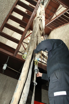 Bokšte džiovinama apie 120 metrų vandens žarnų, kurios buvo naudotos gesinant Tytuvėnų šventovę. Po gaisro ugniagesiai jau nuplovė ir beveik 30 metų sulaukusią gaisro gesinimo mašiną.