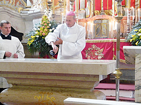 ALTORIUS: Šiaulių vyskupas Eugenijus Bartulis pašventino naująjį altorių: tepė jį aliejais, smilkė.