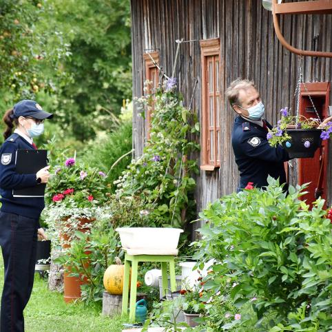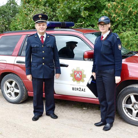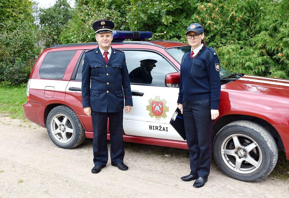 Biržų PGT inspektoriai Nerijus Gudas ir Angelė Darčkienė kartu su kitais ugniagesiais vykdo akciją „Gyvenkime saugiai“.