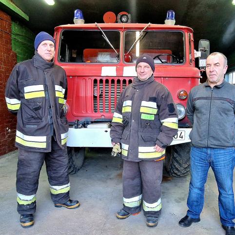 Smilgių komandos ugniagesiai (iš kairės) Remigijus Lapėnas, Žilvinas Ranonis ir skyrininkas Gintaras Variakojis neturi kito pasirinkimo, todėl skuba gesinti gaisrų 45 metų senumo automobiliu „Gaz-66“.