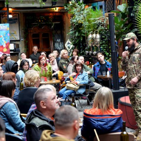 „No­rė­čiau, kad vi­si, kas per­skai­tys šias ei­lu­tes, ga­lu­ti­nai su­pras­tų ir at­si­sa­ky­tų bet ko­kių iliu­zi­jų: nė­ra „ge­rų­jų“ ru­sų, nė­ra tik­ros ru­sų opo­zi­ci­jos, o ga­lu­ti­nia­me re­zul­ta­te po ru­siš­ka kal­ba, ru­siš­ka baž­ny­čia, ru­siš­ka kul­tū­ra atei­na ru­siš­ki tan­kai, ru­siš­ki ba­tai ir ru­siš­kos ra­ke­tos“, – įspė­jo uk­rai­nie­tis žur­na­lis­tas And­rii Ma­ry­niuk (kairėje), po susitikimo su Lvovo internetinio žiniasklaidos portalo „Leopolis“ vyriausiuoju redaktoriumi.