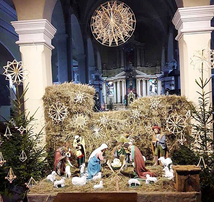 Vabalninko bažnyčios eglė papuošta šiaudiniais žaislais