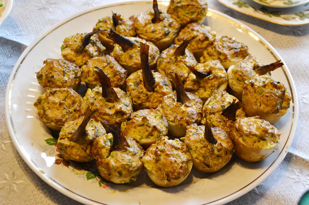 Kietai virtus kiaušinius nulupame, perpjauname pusiau, trynius sudedame į dubenėlį. Trynius paskaniname druska, pipirais, įdedame pjaustytų žalumynų žiupsnį, truputį smulkiau tarkuoto sūrio, majonezo – viską sutriname šakute. Dar vieną sudėtinę įdaro dalį dedame pasirinktinai – tuno ar šprotų (galima ir vytintos dešros tarka patarkuoti). Pasirinktą produktą įmaišome į trynių masę ir su kaupu prikrauname kiaušinio baltymo „kaušelius“. Įdarytas kiaušinių puseles dedame ant smulkių grotelių ir rūkykloje apie valandą parūkome nugenėtos obels šakelėmis.