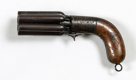 EKSPONATAS: XIX amžiaus vidurio vokiškas šešiavamzdžis 12-ojo kalibro pistoletas „Marijeta“ pavogtas dieną.