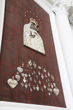 STENDAS: Stiklinio stendo, kuriame buvo eksponuojamos žmonių aukos — juvelyriniai dirbiniai — už patirtas Dievo malones, vietoje, ant sienos, vakar likusios tik žymės. Stendą, kol vyksta tyrimas, nutarta nukabinti.