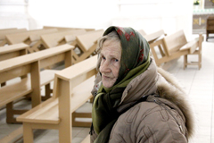 Katedroje klupo senyvo amžiaus moteris. Baigusi maldą ji atsistoja ir ilgai krapštosi rankinėje. Ant grindų pabyra metalinės monetos. Surinkusi pinigus moteris monetas vieną po kitos sumeta į greta stovinčią aukų dėžutę.