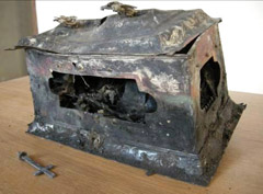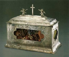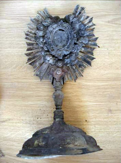 RELIKVIJORIUS: Relikvijorius iš Joniškio Švč. Mergelės Marijos Ėmimo į dangų bažnyčios iki gaisro ir preliminariai identifikuoti fragmentai po gaisro. Šv. Martininjono Relikvijorius, Vilnius (?) XVII amžiaus IV ketvirtis. Taisytas 1711 metais nežinomo Mintaujos auksakalio. Sidabras.