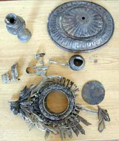 RELIKVIJORIUS: Šv. Kryžiaus relikvijorius iš Šiaulėnų Šv. Onos bažnyčios ir preliminariai identifikuoti fragmentai po gaisro. Mykolo Neviadomskio dirbtuvės (?) Lietuva, XIX amžiaus pabaiga. Žalvaris.