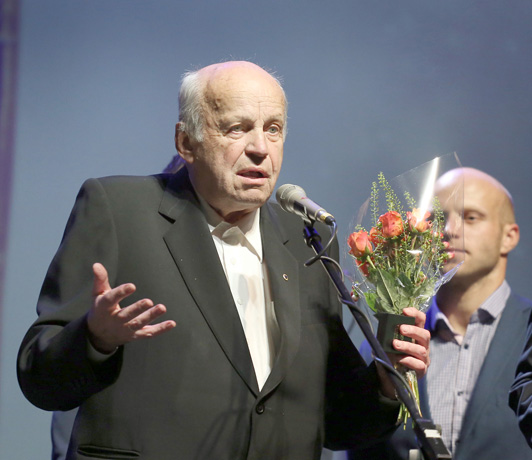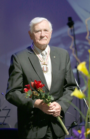 ŠVIE­SUO­LIS: Me­no­ty­ri­nin­kas pro­fe­so­rius Vy­te­nis Rim­kus už nuo­pel­nus kul­tū­rai ap­do­va­no­tas pa­dė­kos ženk­lu.