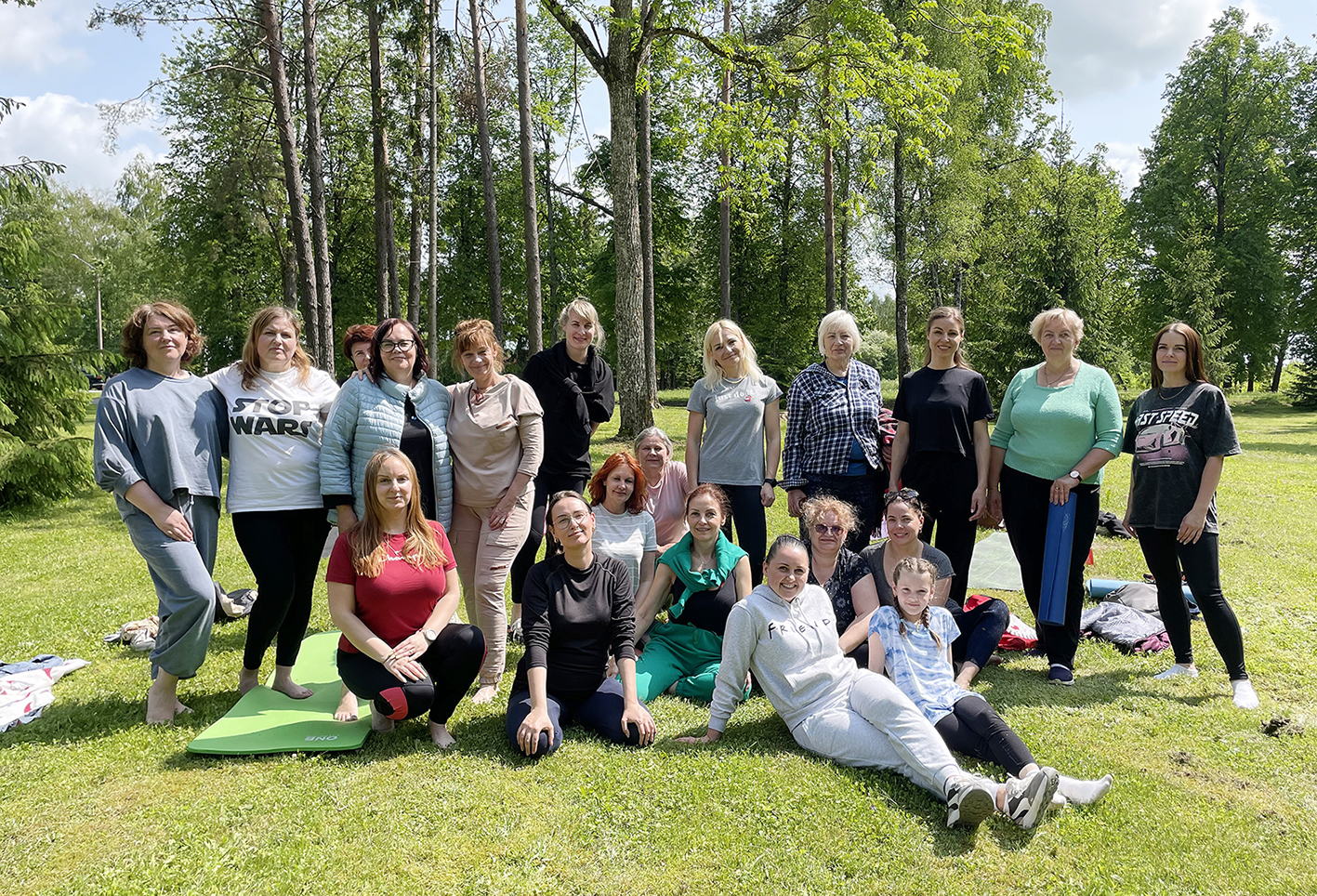 „Biržų moterų klubo“ narės Likėnų sanatorijos parke braidė basomis Likėnų parke ir saulės atokaitoje įsitaisė ant žolės rytinei mankštai.