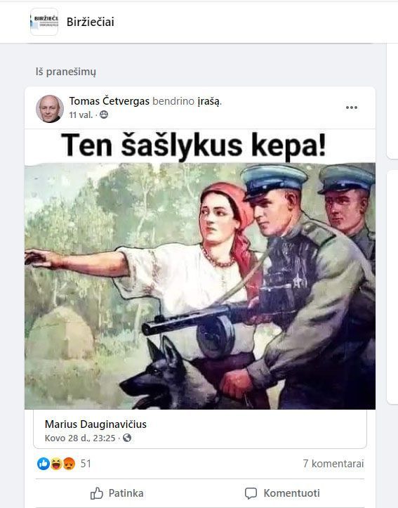 Paveikslėlyje vaizduojami sovietiniai pokariniai pasieniečiai su šautuvais. Greta stovi moteris ryškiai raudona skarele. Virš paveikslėlio užrašas: „Ten šašlykus kepa“. Šis paveikslėlis lygina Lietuvos policininkus su sovietiniais pasieniečiais, kuriems medžioti karantino nesilaikančius žmones padeda skundikai.