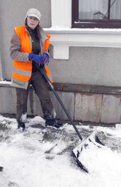 Šiaulių mieste kastuvais vakar darbavosi per 50 UAB „Specializuoto transporto“ darbuotojų. Mūsųs sutikta Ingrida plušėjo nuo ankstaus ryto. Ji nukasė sniegą aplink Savivaldybės pastatą. Moteris šį darbą dirba kelerius metus. Žino, jei prisnigo — šoki į darbo kostiumą ir skubi į savo tvarkomą teritoriją. „Jei pūga stipri, nedaug nuveikiame. Nukasi ir vėl užpusto“, — sakė moteris.
