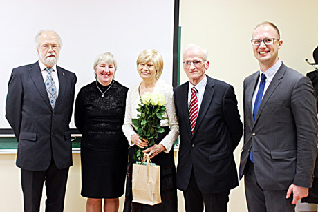SUSITIKIMAS: (Iš kairės) Latvijos rašytojų sąjungos narys Valdis Rūmnieks, Šiaulių Universiteto dr. Regina Kvašytė, Dzintra Elga Irbytė–Staniulienė, Latvijos rašytojų sąjungos narys Andrejs Migla ir Latvijos literatūros centro direktorius Janis Oga praėjusiais metais ŠU Humanitariniame fakultete vertėjos jubiliejui skirtame renginyje.