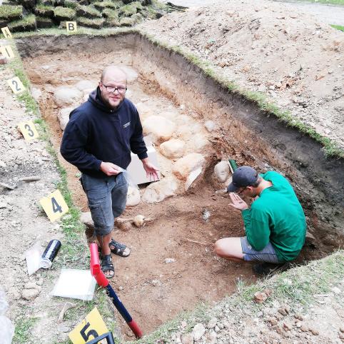 Ar­cheo­lo­gas K. Du­de­ris (kai­rė­je): "Iš vi­sų ty­ri­mų ge­riau­si ra­di­niai – čia. At­kas­ta baž­ny­čios pa­ma­tų da­lis, pa­lai­do­ji­mai, va­rio ly­di­nio smeig­tu­kas, li­tur­gi­nių dra­bu­žių frag­men­tai ir kt".