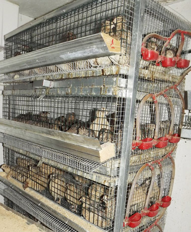 NARVAI: Prie vienos iš sienų iškilęs penkių aukštų narvas su girdymo indeliais šonuose, lesalų loveliais.