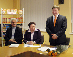 PAGALBA: „Fasmos“ įmonės savininkas Sigitas Krivickas (dešinėje) džiaugėsi, kad bendradarbiavimas su rajono Darbo birža jam padėjo modernizuoti dribsnių gamybą ir suteikti darbo šešiems bedarbiams. Šalia — biržos direktorė Irena Urbelienė ir Baisogalos seniūnas Romas Kalvaitis.