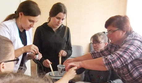 Po teo­ri­nės pa­skai­tos R. Ka­no­vie­nė mo­te­ris pa­kvie­tė į lū­pų bal­za­mo ga­my­bą. Jam rei­kė­jo 2 šaukš­tų ko­ko­sų alie­jaus (jis bū­na kie­tos kon­sis­ten­ci­jos), 1 šaukš­te­lio ka­ka­vos svies­to, 1 šaukš­to džio­vin­tų ro­žių žied­la­pių, 1 kap­su­lės A ir E vi­ta­mi­no (bū­na pirk­ti vais­ti­nė­se), 0,5 šaukš­te­lio bi­čių vaš­ko, 3 la­še­lių ete­ri­nio ro­žių alie­jaus. No­rint ki­to­kio kva­po, ga­li­ma pa­si­rink­ti ete­ri­nį alie­jų pa­gal sko­nį: apel­si­nų, cit­ri­nų ar ki­to­kio aro­ma­to.