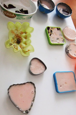 Pa­sak ren­gi­nį or­ga­ni­za­vu­sios bib­lio­te­ki­nin­kės Dia­nos Ki­de­lie­nės, kai ku­rios mo­te­rys tam pa­nau­do­jo vai­kiš­kus tuš­čia­vi­du­rius žais­liu­kus, taip iš­gau­na­ma įdo­mes­nė for­ma. Ga­li­ma pils­ty­ti ir į įpras­tas kvad­ra­ti­nes ar stač­iakam­pes for­me­les. Taip pat tin­ka mui­lą sluoks­niuo­ti, už­pi­lant sluoks­nį su vis ki­to­kiais prie­dais ar nu­spal­vin­tą ki­tais da­žais.