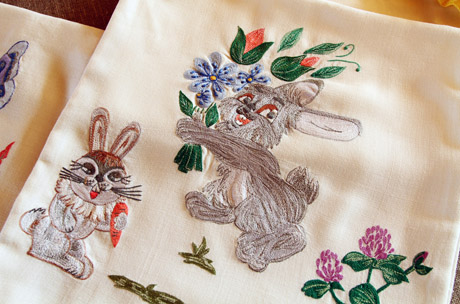 UŽVALKALAI: Savo mažam sūneliui D. Ūsienė patalynės užvalkalus išsiuvinėjo kiškučiais.