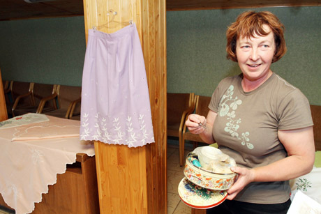 AUTORĖ: Šiaulių universiteto Botanikos sodo darbuotoja Daiva Ūsienė savo siuvinėtus darbus eksponavo pirmą kartą. Rankose – savo vestuvėms išsiuvinėta prijuostė ir skarelė.