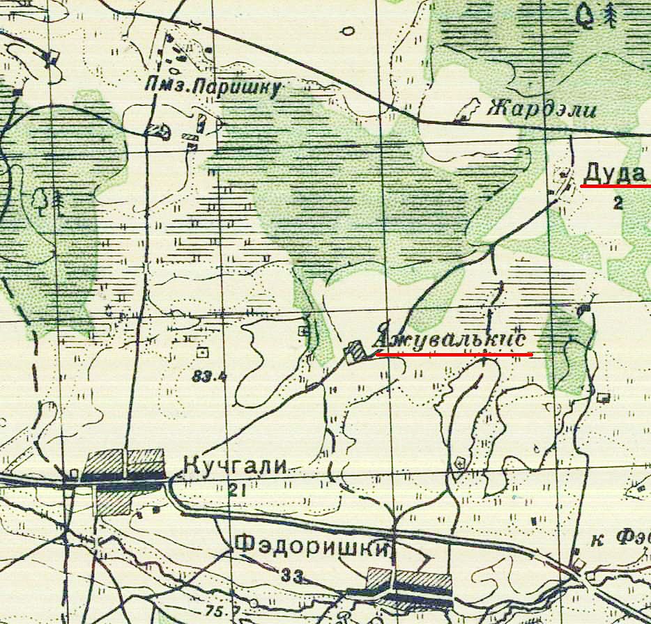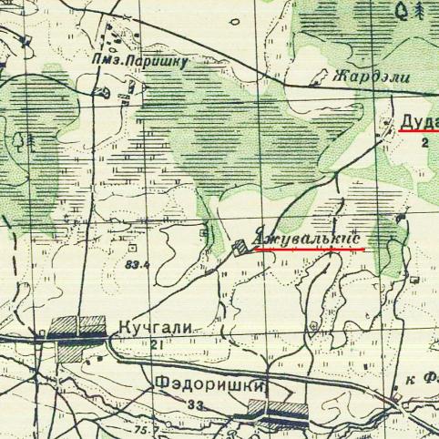 Ki­tos vie­to­vės jau ne­ban­dom ieš­kot bris­da­mi tie­siai miš­ku, ren­ka­mės miš­ko ke­lią ve­dan­tį link Kuč­ga­lio ir, iš­nė­rę į pa­lau­kę, praė­ję ka­pi­nai­tes, ny­ram į miš­ką link Kve­da­riš­kio žvy­ro kar­je­ro. Bu­vęs ki­tas Dū­dų gy­ve­ni­mas čia pat, vos įlin­dus miš­kan – UŽU­VAL­KIS (ki­taip – PU­KI­NĖ). Už­ma­tom gra­žų kal­ne­lį, lyg pil­ka­pį, bet ten tik bu­vu­sios so­dy­bos vie­ta, o ant kal­ne­lio, tik­riau­siai, gry­čios vie­toj – neį­ti­kė­ti­nas ra­di­nys: kry­žius – kop­lyts­tul­pio vir­šū­nė... kaip ir iš­gu­lė­jo iš­ti­sus de­šimt­me­čius?..
