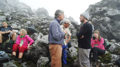 Mūsų vedlys nuneša ryžių auką. Taip kaskart, kai lipa į kalną. Grįžęs paprašo mūsų kalbėti tyliai, kitaip galį kilti smarkus vėjas — Apo nemėgsta triukšmo. Nutylame, bet audra nesiliauja.
