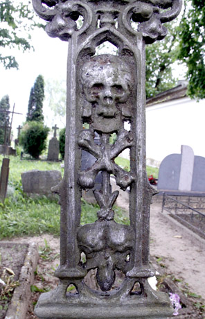 SIMBOLIKA: Prie šio kapo V. Stanislovaitis veda turistus parodyti neįprastų simbolių, tarp jų – česnako galvučių.