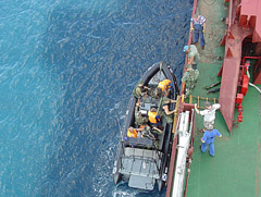 Visiems yra duotas įsakymas — nieko neprileisti prie laivo arčiau, negu 500 metrų. Pirmi šūviai — perspėjamieji, į orą. Jei jų nebūtų paisoma, apsauga šautų į bet ką, kas mėgintų priartėti prie laivo. Jautėmės pakankamai saugūs, nors įtampa laive egzistavo.