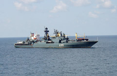 LAIVAS: Lietuvių motorlaivį nuo piratų saugojo rusų karinis laivas „Admiral Chabonenko“.