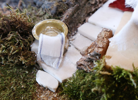 „Vyko daug ginčų, kur Jėzus Kristus buvo pakrikštytas. 2015 metais mokslininkai Užjordanės Betanijoje, ties šia brasta, atkasė akmenį su skyle“, – sako A. Gedvilas. Šioje maketo vietoje jis pakabino indą ir rankšluostį.