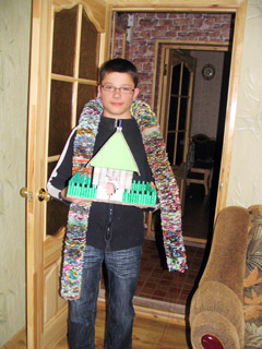 Ir sodyba. Namo „rąstai“ iš plono popieriaus rutuliukų, sutvirtintų klijais. Vienam rąstui reikia kelių šimtų tokių rutuliukų. Sklypas išklotas mažyčiais akmenukais. Justas suskaičiavo, jog akmenukų devyni tūkstančiai aštuoni šimtai.