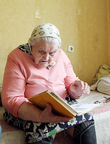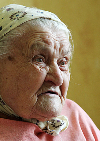 Antrą šimtmetį pradėjusi senolė padedama dukters vaikšto po namus, išeina į lauką, tačiau dažniau kojas atstoja vežimėlis. Kiekvieną rytą ir vakarą eina į atskirą kambarėlį kalbėti poterių – didžiąją dienos dalį močiutė susikaupusi maldai.