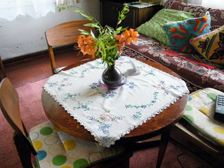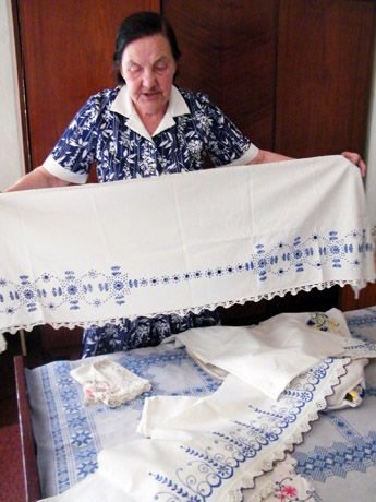 POMĖGIS: Jaunystėje Stefanija Šaltienė mėgo siuvinėti. Siuvinėtos staltiesėlės, užuolaidėlės, paveiksliukai iki šiol puošia Šalčių namus.