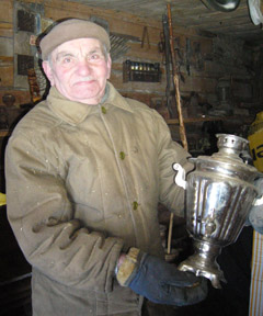 EKSPONATAS: Iš klėtelėje sudėtų eksponatų lentynos Juozas mockūnas ištraukia senovinį rusišką virdulį.