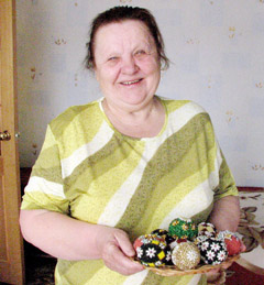Kuršėniškės Onos Žalpienės margučiai išpuošti karoliukais. Maždaug prieš penkerius metus, kepant kiaušinienę, jai kilo mintis kiaušinį kaip nors pagražinti.