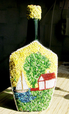 GRŪDELIAI: Butelis papuoštas nudažytais ryžiais.