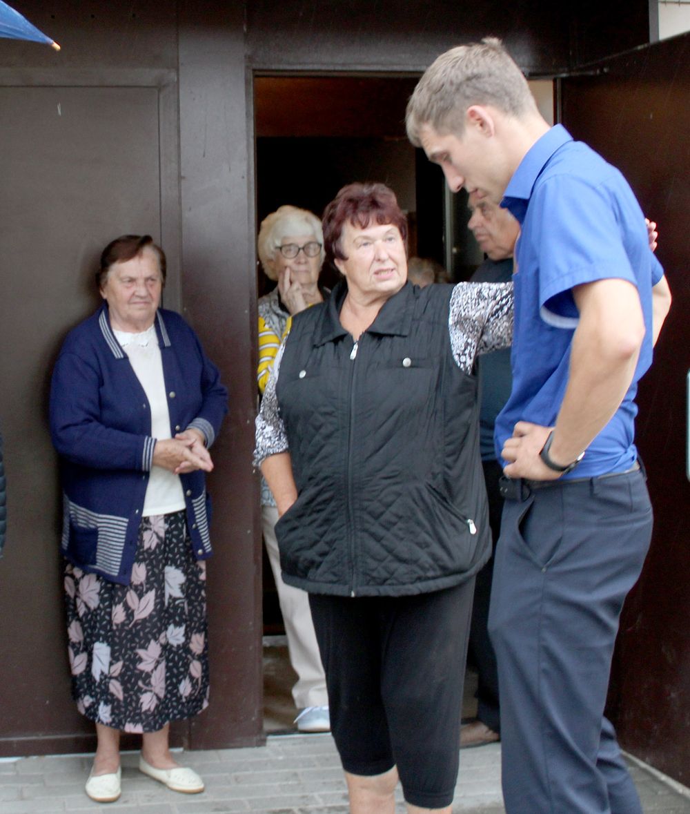 Tos pačios dienos vakarą prie laiptinės valdžios laukė namo gyventojai. Į susitikimą atvyko Savivaldybės ekologė J. Bruniuvienė, vyr. specialistas V. Viederis, rangovų atstovas, laikinai einanti miesto seniūnės pareigas K. Undzėnienė ir galiausiai atvyko meras V. Jareckas.