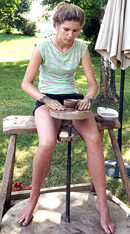Prie kito ilgo stalo šurmuliuoja paaugliai, kuriantys molio švilpynes. Pasigirsta skardus garsas – viena jau švilpia, pavyko.