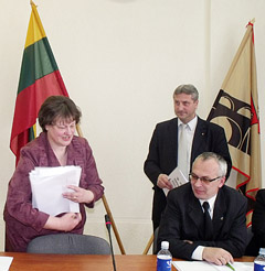 KĖDĖ: Rinkimų apygardos pirmininkė Birutė Vanagienė užleido valdžios kėdę ką tik išrinktam merui Sauliui Gegieckui (stovi).