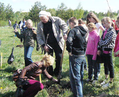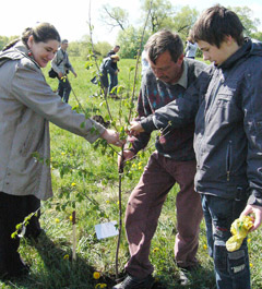 GIMNAZIJA: Joniškio Mato Slančiausko gimnazijos mokiniai vyšnaites sodino kartu su direktoriumi Vaclovu Martinaičiu.