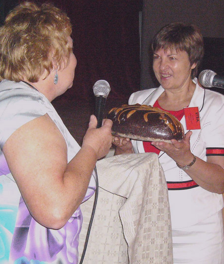 TREČDALIS: Lietuvos diabeto asociacijos prezidentė Vida Augustinienė (dešinėje), iš Joniškio diabeto klubo pirmininkės Aldonos Goštautienės priimdama joniškietiškos duonos kepalą, pastebėjo, kad šiemet renginyje dalyvauja sergantieji diabetu iš trečdalio asociacijos Lietuvoje padalinių.