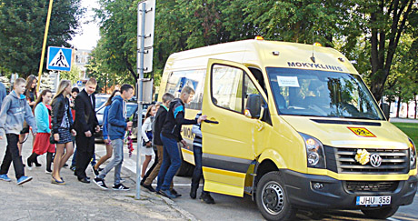 AU­TO­BU­SIU­KAS: Nau­ją­jį au­to­bu­siu­ką Pak­ruo­jy­je pa­si­ti­kę Bal­sių moks­lei­viai sku­bė­jo užim­ti vie­tas ja­me.