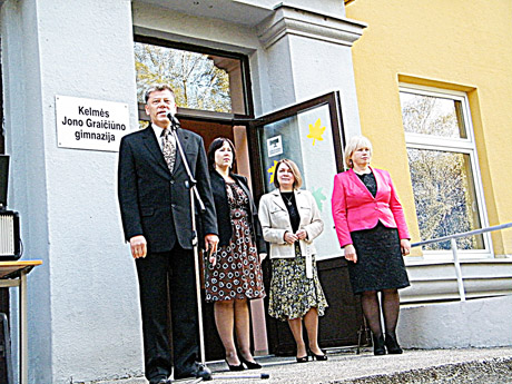 SVEIKINIMAI: Gimnazistus sveikino direktorius Rimantas Bielskis, Savivaldybės administracijos direktorė Irena Sirusienė (dešinėje).