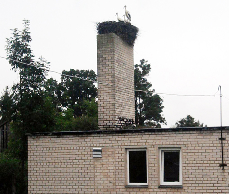 Ūdekiečiai mano, kad jauniklis koją susižeidė į elektros laidą, nutiestą į pieno supirkimo punktą. Ant šio punkto kamino ir įsitaisiusi lizdą gandrų šeimyna.
