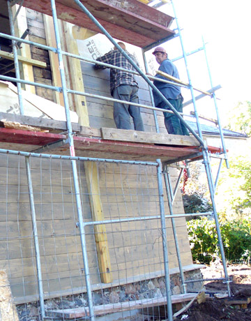 SIENA: Labiausiai nukentėjusi sinagogos siena jau baigiama tvarkyti – kalamos išorės lentos.